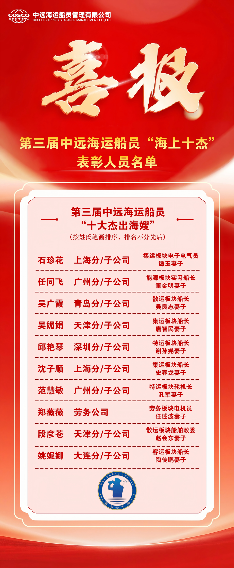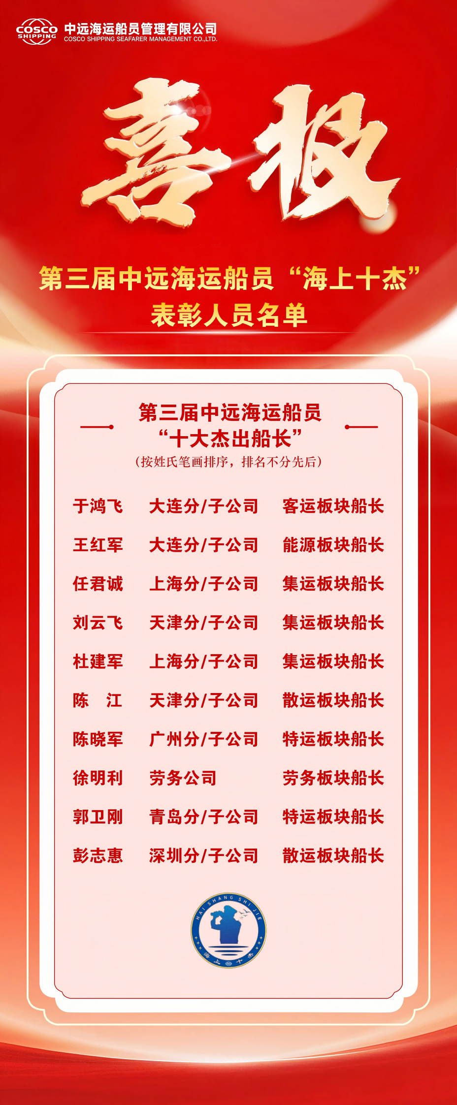 为深入贯彻落实习近平总书记与“中远海运玫瑰”轮通话精神,进一步提升船员的幸福感、自豪感、荣誉感,公司于2024年12月26日正式启动第三届中远海运船员“海上十杰”评选表彰宣传活动。2025年12月26日,值此船员公司成立八周年之际,第三届“海上十杰”六大系列表彰名单正式揭晓。