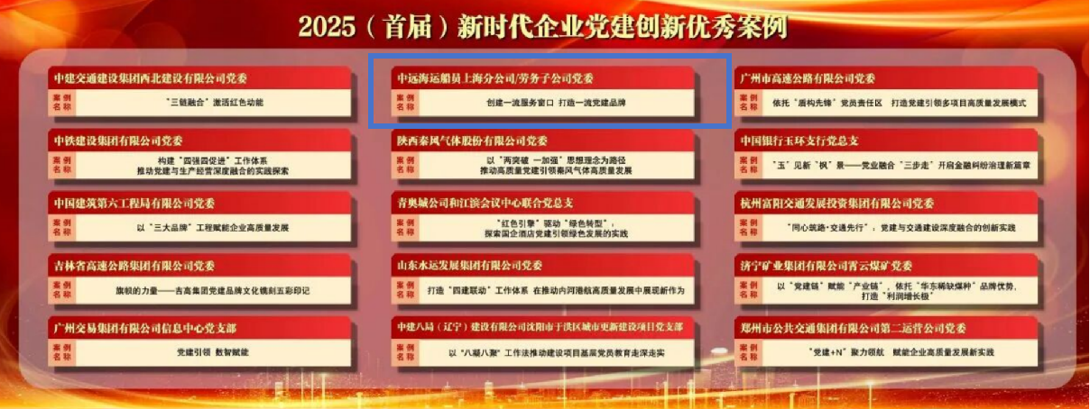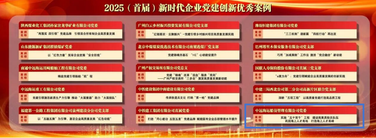 9月20日,2025(首届)新时代企业党建经验交流会暨企业党建创新优秀案例发布仪式在北京举行。公司党委《实施“五十百千”工程 建设高素质船员队伍 巩固海上人才高地 打造海上人才高峰》党建案例、上海分/子公司党委《创建一流服务窗口 打造一流党建品牌》党建品牌案例成功入选2025(首届)新时代企业党建创新优秀案例。