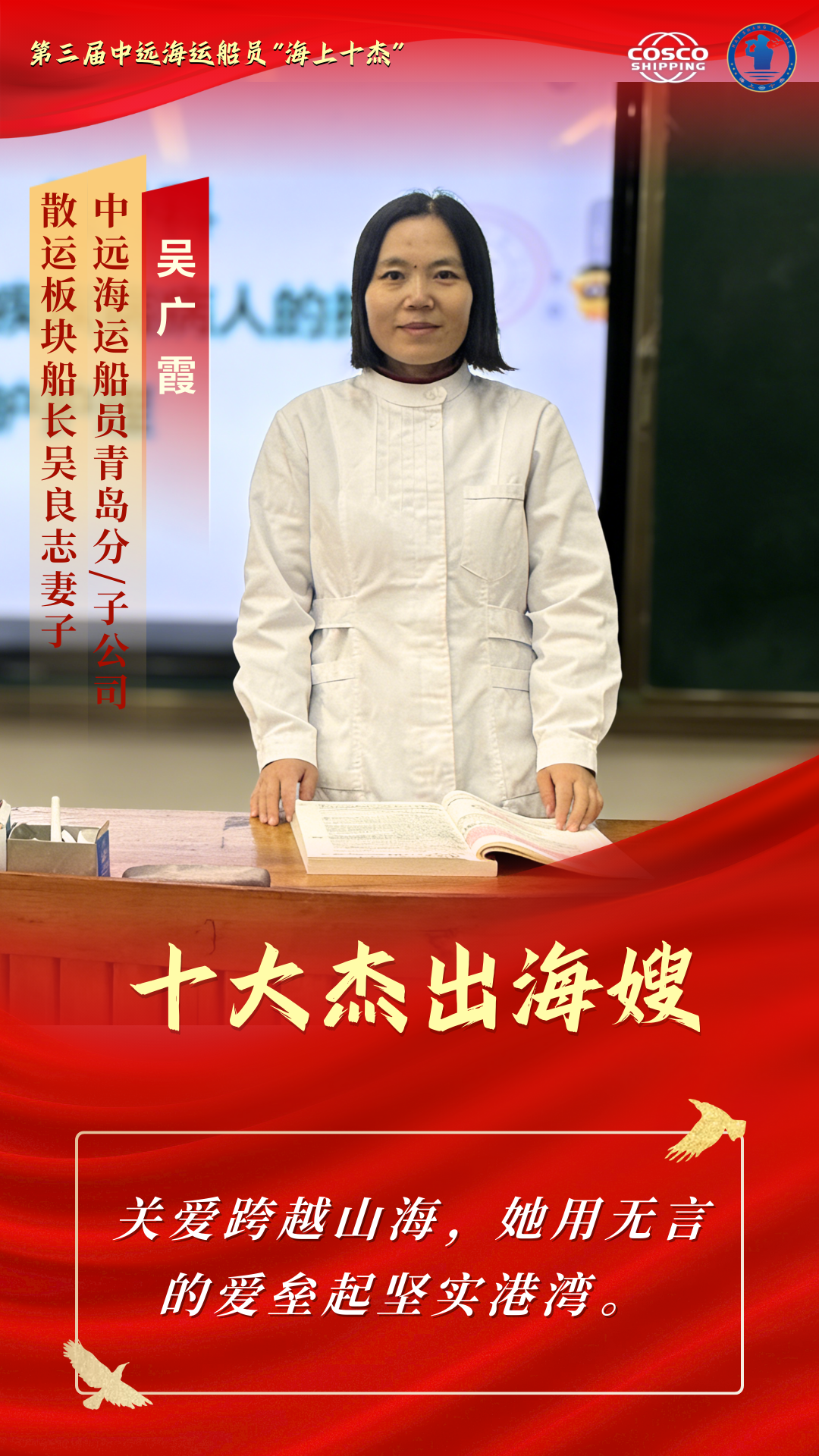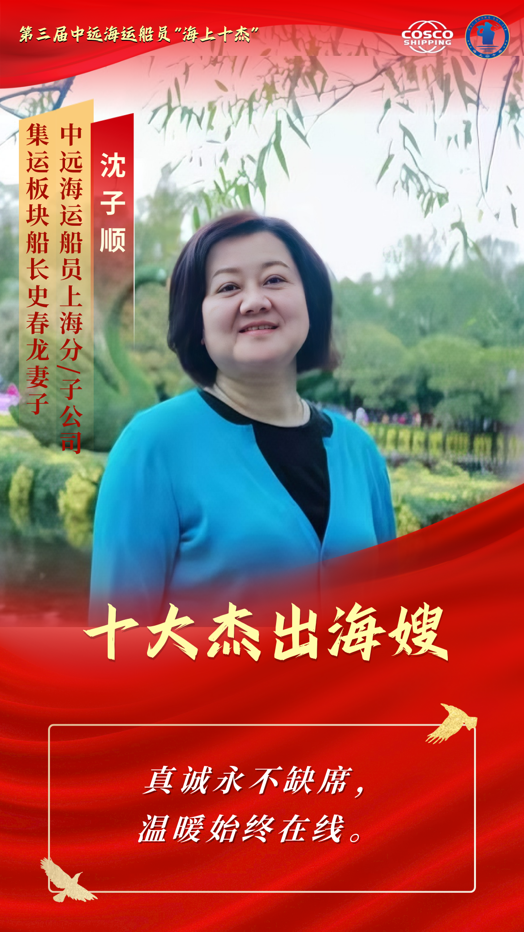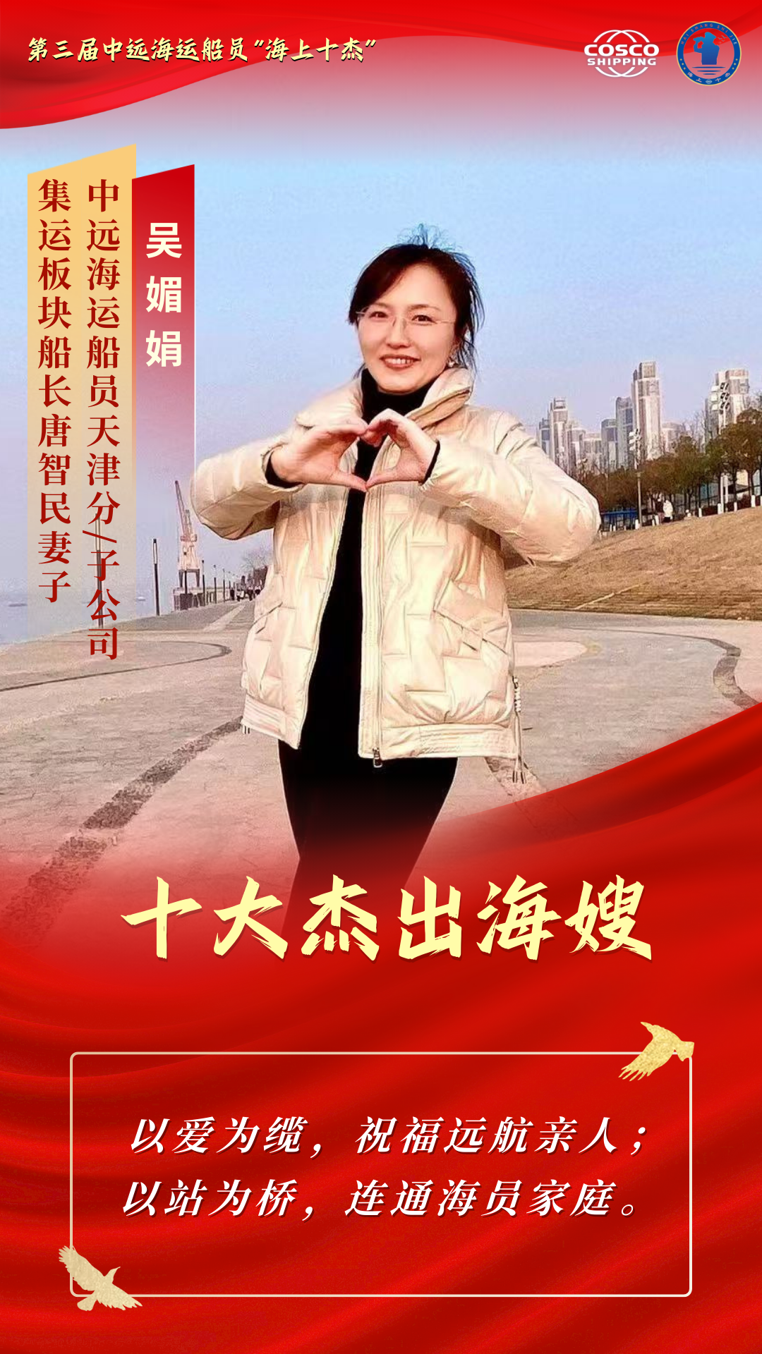 她们是最深情的人 把长长的思念化成温暖的等待 她们是最坚强的人 把家庭的重担锻成牢固的铠甲 她们是最懂大海的人 把彼此的理解沉淀为最深的默契 她们是平凡里的伟大 是无声处的光芒 本期“十杰风采”专栏 聚焦第三届中远海运船员“十大杰出海嫂” 让我们走进十杰海嫂的故事 去聆听那些藏在浪花与港湾里的坚守 去感受那份在岁月流转中愈发醇厚的爱与担当 石珍花,湖南省涟源市三甲乡某小学教师。长年扎根乡村教学岗位,在校肩负繁重的授课任务,在家扛起琐碎的家务和抚育孩子的责任,被所在地区表彰为“平安家庭”。担任中远海运船员上海分/子公司长沙海嫂联络站站长14年来,她热心帮助有困难的海嫂、海宝和公休船员,积极参加公司“红蓝共建”活动,为拓展深化“红蓝共建”品牌做出贡献。日常生活中,石珍花积极介绍亲友、乡邻加入船员职业,以实际行动宣传航海文化。 任同飞,邮政行业基层网点负责人。在工作中,她推行“微笑服务” “限时办结”经验,是敢创新、善开拓、勇担当的邮政金融业务骨干,多次荣获“先进工作者”。在生活中,她悉心照料年过九旬的奶奶和身体不便的公公,辛勤抚育一对双胞胎女儿,将家庭打理得井井有条、温馨和睦,是独自挑起家庭重担的“女超人”。在海嫂站工作中,她积极参与海嫂联络站日常活动,热心公益事业、传播航海文化,鼓励亲友和同学从事航海事业,以真挚关怀和实际行动帮助其他船员家庭。她以坚韧的意志和温暖的大爱,在平凡生活中谱写了不平凡的奉献篇章,充分展现了新时代海嫂的良好精神风貌。