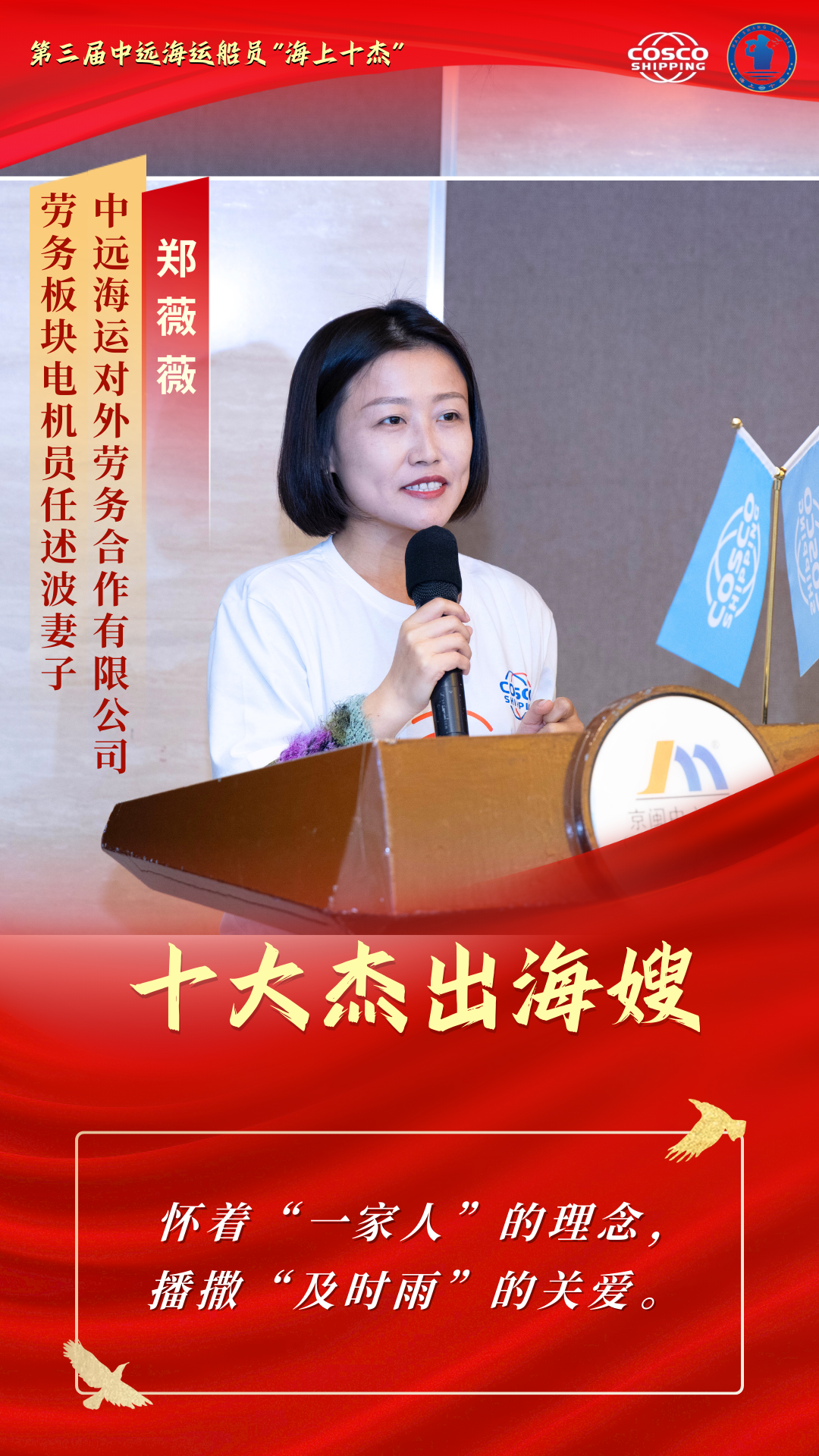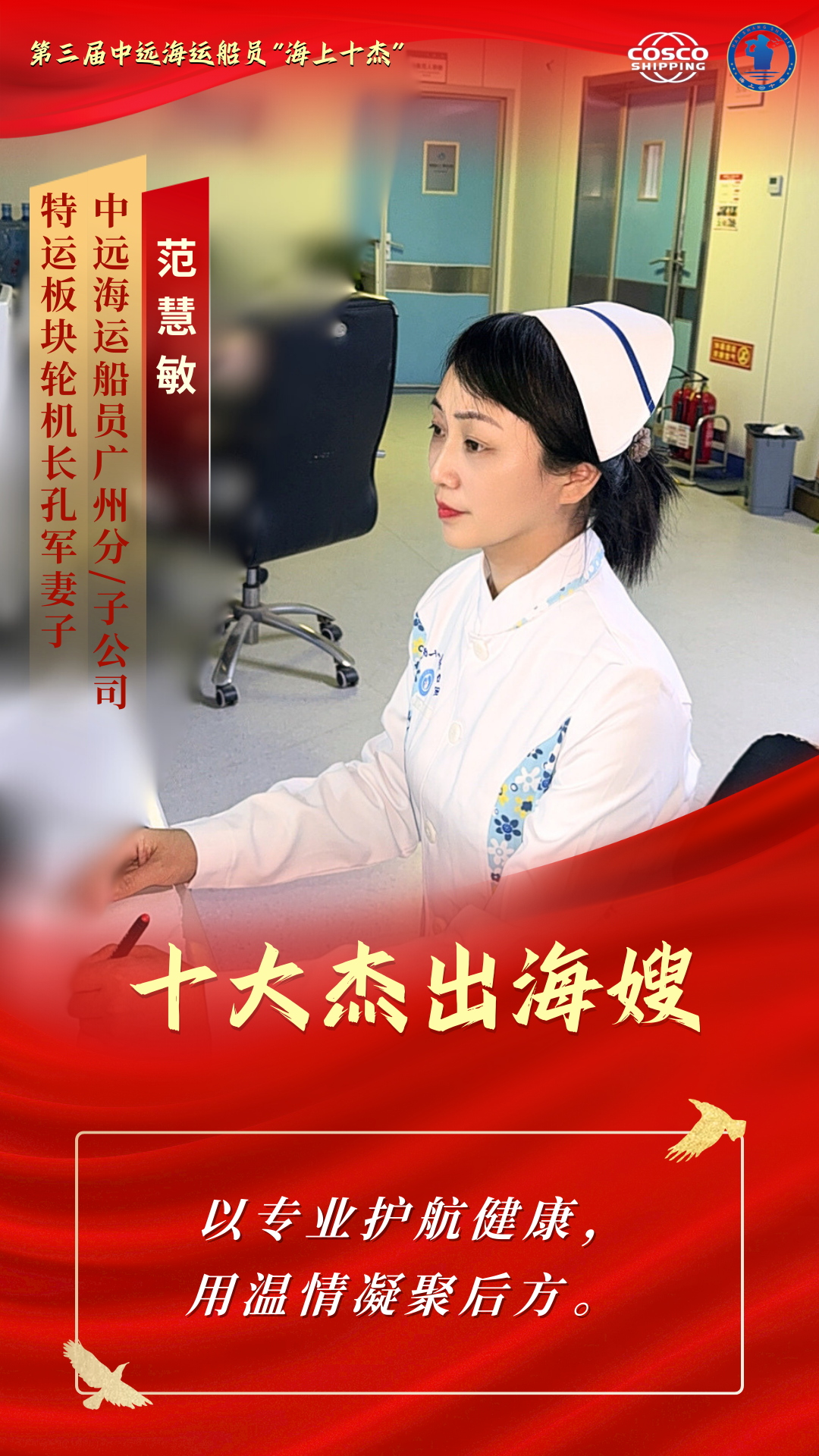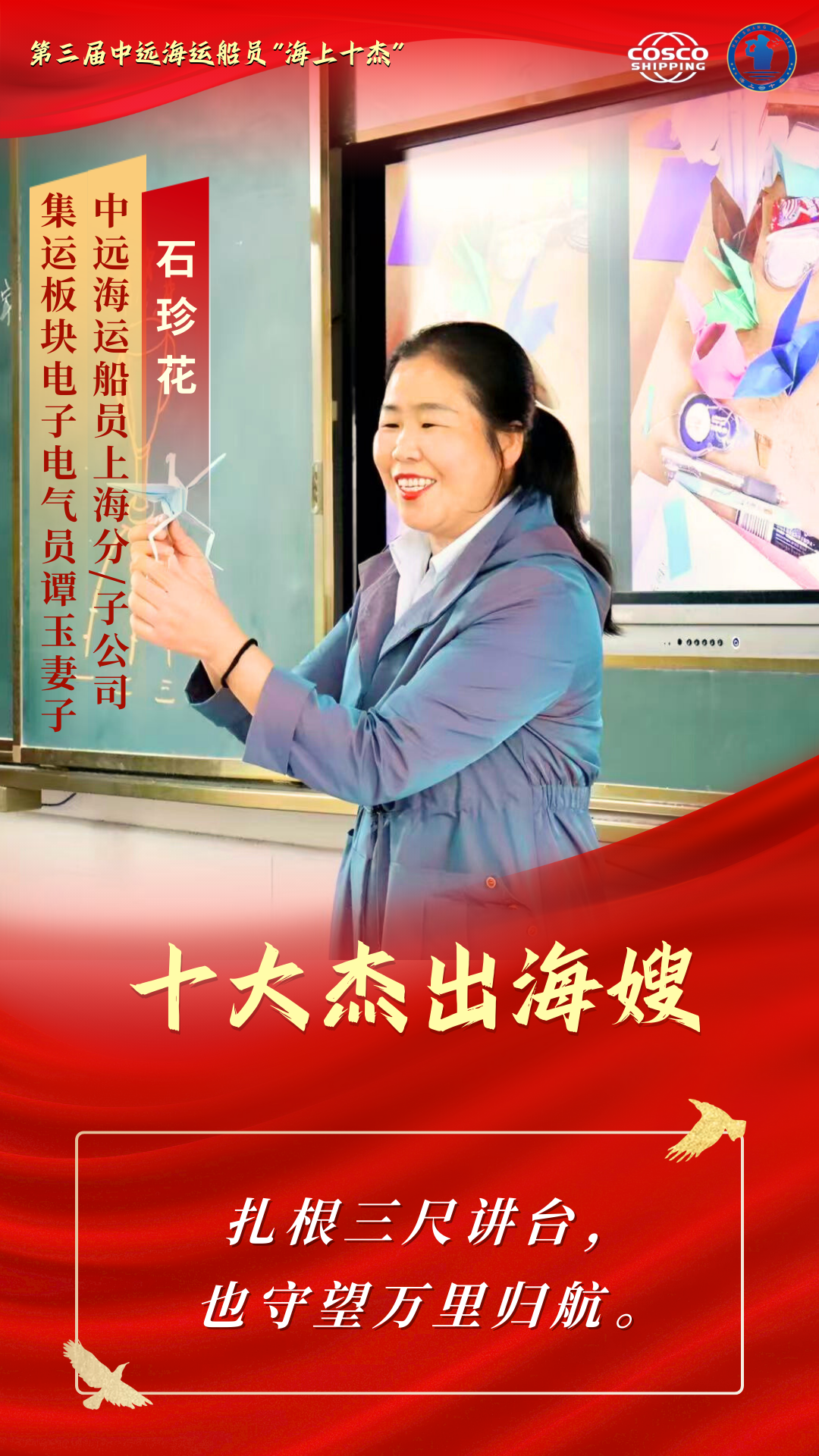 她们是最深情的人 把长长的思念化成温暖的等待 她们是最坚强的人 把家庭的重担锻成牢固的铠甲 她们是最懂大海的人 把彼此的理解沉淀为最深的默契 她们是平凡里的伟大 是无声处的光芒 本期“十杰风采”专栏 聚焦第三届中远海运船员“十大杰出海嫂” 让我们走进十杰海嫂的故事 去聆听那些藏在浪花与港湾里的坚守 去感受那份在岁月流转中愈发醇厚的爱与担当 石珍花,湖南省涟源市三甲乡某小学教师。长年扎根乡村教学岗位,在校肩负繁重的授课任务,在家扛起琐碎的家务和抚育孩子的责任,被所在地区表彰为“平安家庭”。担任中远海运船员上海分/子公司长沙海嫂联络站站长14年来,她热心帮助有困难的海嫂、海宝和公休船员,积极参加公司“红蓝共建”活动,为拓展深化“红蓝共建”品牌做出贡献。日常生活中,石珍花积极介绍亲友、乡邻加入船员职业,以实际行动宣传航海文化。 任同飞,邮政行业基层网点负责人。在工作中,她推行“微笑服务” “限时办结”经验,是敢创新、善开拓、勇担当的邮政金融业务骨干,多次荣获“先进工作者”。在生活中,她悉心照料年过九旬的奶奶和身体不便的公公,辛勤抚育一对双胞胎女儿,将家庭打理得井井有条、温馨和睦,是独自挑起家庭重担的“女超人”。在海嫂站工作中,她积极参与海嫂联络站日常活动,热心公益事业、传播航海文化,鼓励亲友和同学从事航海事业,以真挚关怀和实际行动帮助其他船员家庭。她以坚韧的意志和温暖的大爱,在平凡生活中谱写了不平凡的奉献篇章,充分展现了新时代海嫂的良好精神风貌。
