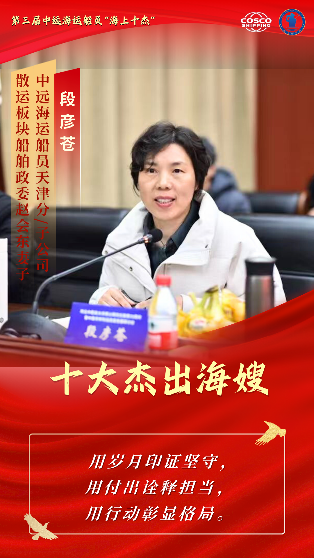 郑薇薇,劳务公司福建地区海嫂联络站站长。原高等院校编辑部编辑,曾参与出版多部教辅、工具书。她用岁月印证坚守,成为海嫂18年来,全职扛起家庭重担,稳稳撑起一片天空,孝顺长辈侍奉公婆,抚养女儿健康成长,默默支持丈夫在远洋一线工作。她用付出诠释担当,在全职操持家务的日子里,她陪伴患病的公婆寻医问药,耐心教育引导女儿勇敢坚强,作为家委会成员参与班级、学校集体活动,连续7年荣获“优秀学生家长”。担任站长三年期间,组织并参与“红蓝共建”活动,积极分享育儿经验、联络周末活动,发动家属互帮互助,把海嫂联络站建成链接个人小家与船员大家的“连心桥”。 段彦苍,高等院校教授、博士生导师。在教学工作岗位上,她主持国家自然科学基金课题3项,发表学术论文100余篇,参编教材论著10余部,荣获省级科学技术奖4项。任天津分/子公司石家庄海嫂联络站站长13年,她在建好小家的同时推己及人,把所有船员家属看作“一家人”。疫情期间,她为国际航线船员争取防疫检疫资源,替公司分忧解难。平常日子,她总会给需要帮助的家属送去“及时雨”,替寻医问诊、咨询办事的家属留一扇“方便之门”。她倡导微信群“云读书”,每日与海嫂共享知识、分享经验。她主动讲好船员故事、传播航海文化,先后动员外甥、堂侄报考航海院校。曾荣获公司首届“金牌站长”称号。 姚妮娜,大连分/子公司海嫂联络总站兼甘井子区联络站站长。在生活中,她坚强面对病痛折磨,悉心照料双方老人,帮助孩子战胜成长中的困境和压力,从不让远洋一线的丈夫分心。在工作中,她既是大连地区船员家庭的“守护者”,也是海嫂姐妹的“暖心人”。姚妮娜通过微信群、线下座谈主动倾听海嫂心声,及时了解她们的需求、化解她们的顾虑,让无数个小家庭凝聚成温暖大家庭。她积极参与筹备“红蓝共建”活动,通过开展学习研讨、亲子互动等丰富多彩的活动,让海员与家属们感受到来自大家庭的温暖。曾荣获公司首届“金牌站长”称号。