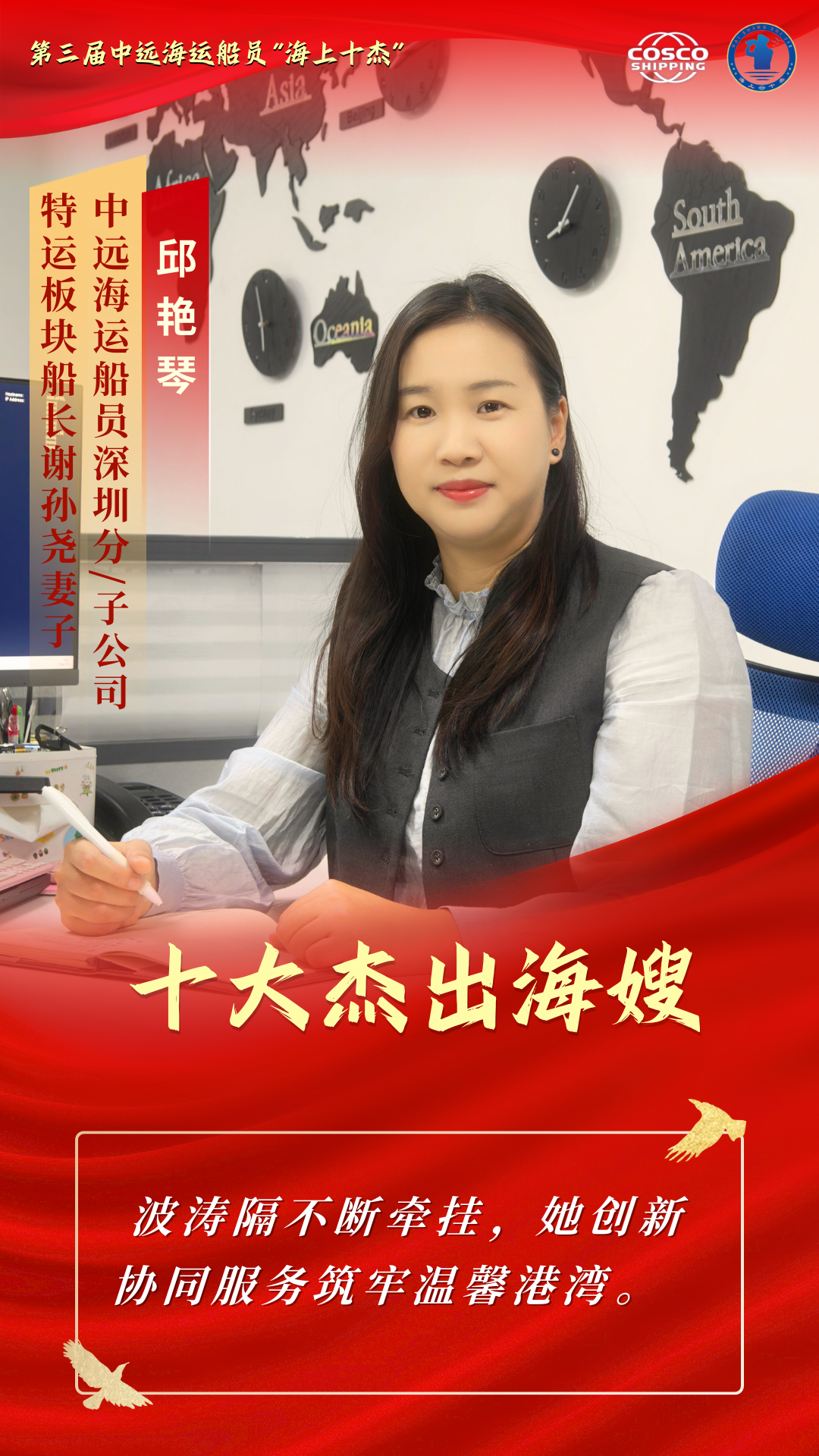 邱艳琴,货运代理行业关务管理岗位负责人。在工作中,她爱岗敬业,踏实勤勉,是公司中备受认可的骨干员工;回归家庭,她同样尽心尽责,悉心照料年迈公婆,陪伴教育成长中的孩子,是家人口中的“全能女神”。担任深圳分/子公司厦门海嫂联络站站长以来,她创新线上线下联动服务模式,逐步构建覆盖深圳、广州、上海3家分/子公司百余户船员家庭的协同服务网络,在共同抗击“杜苏芮”台风、辅助家属心理疏导、助力海宝备战中高考等倾注心力,赢得了大家的尊重。工作之余,邱艳琴曾走进集美大学,与学子们分享自己作为海嫂的心路历程,讲述航海家庭背后的坚守与奉献,激发年轻一代对航海事业的向往。她以实际行动诠释了新时代海嫂的担当与情怀,曾获广东省海员工会“优秀海嫂”称号。