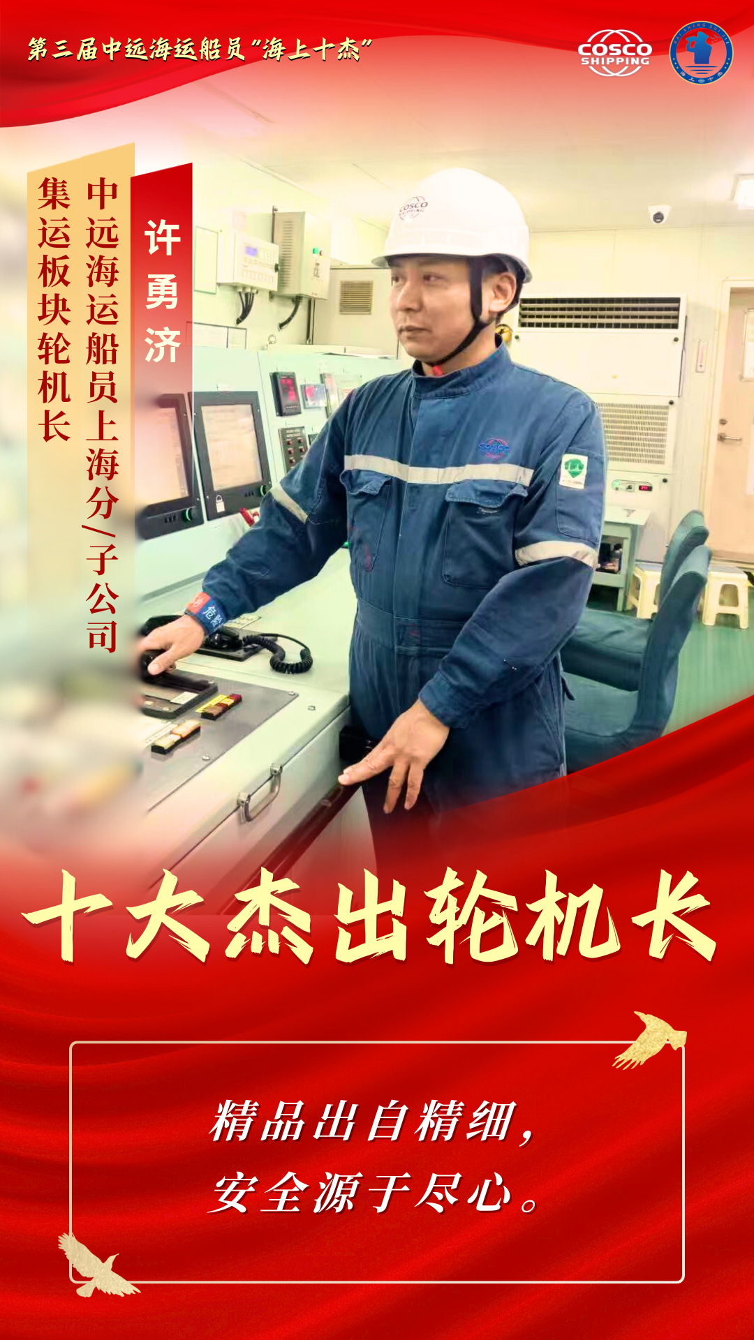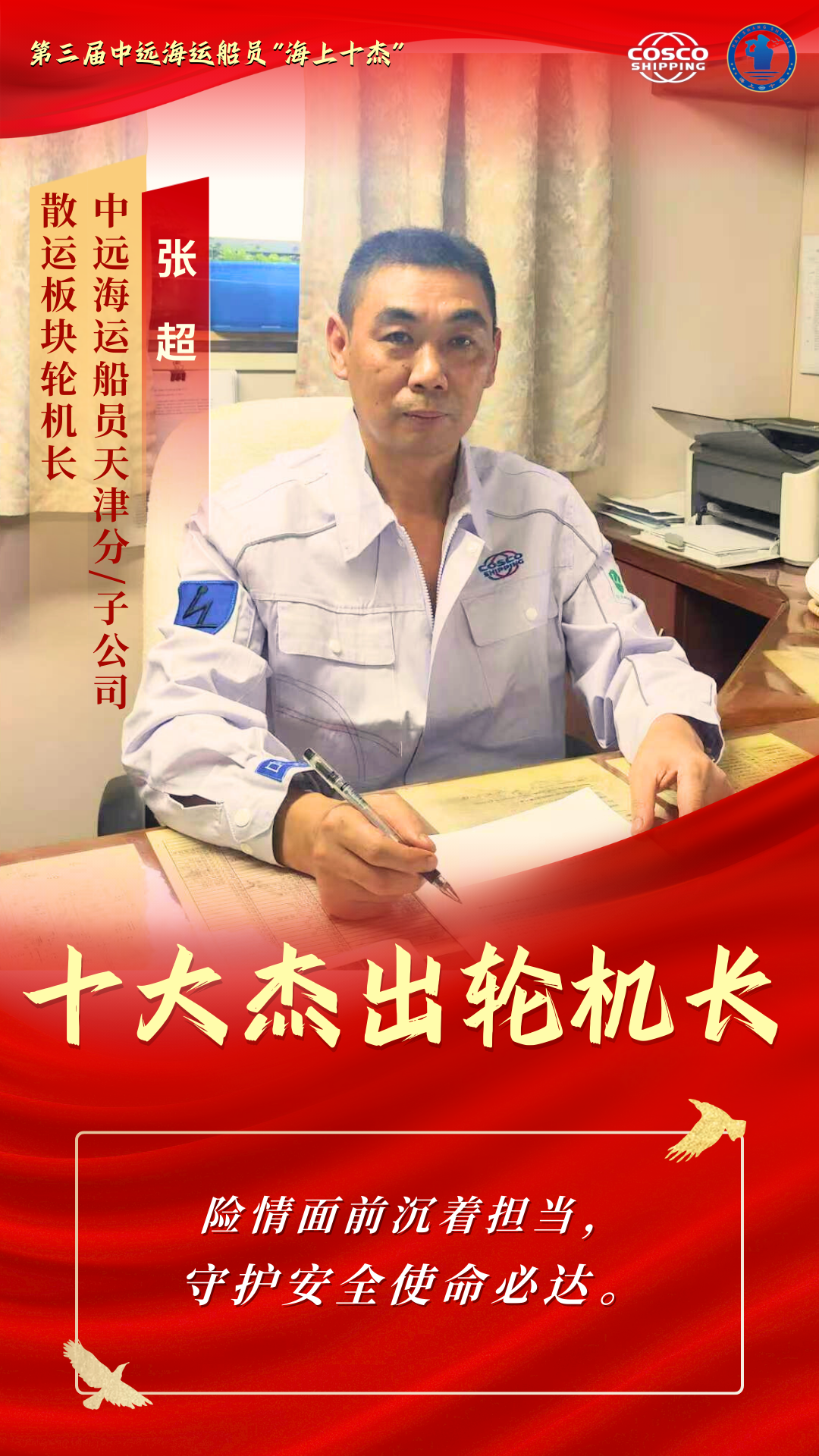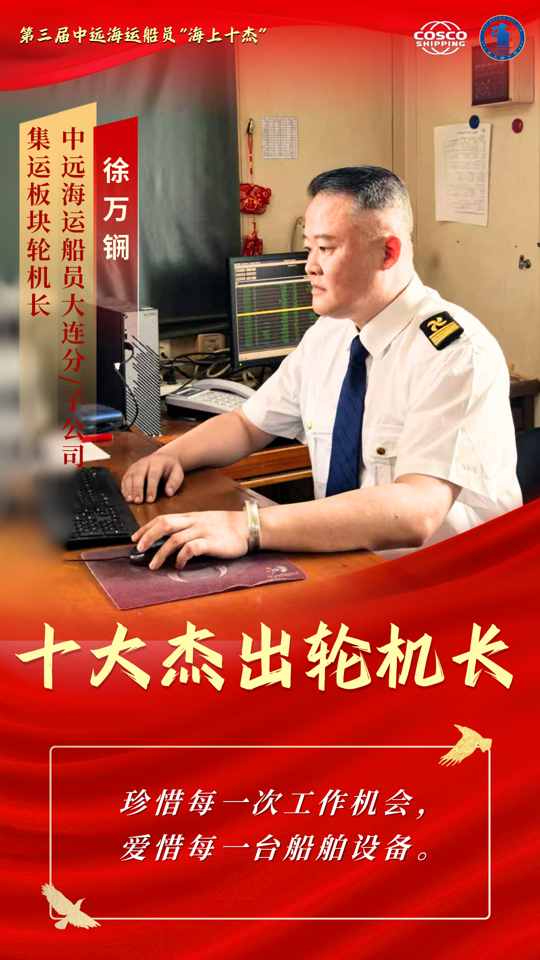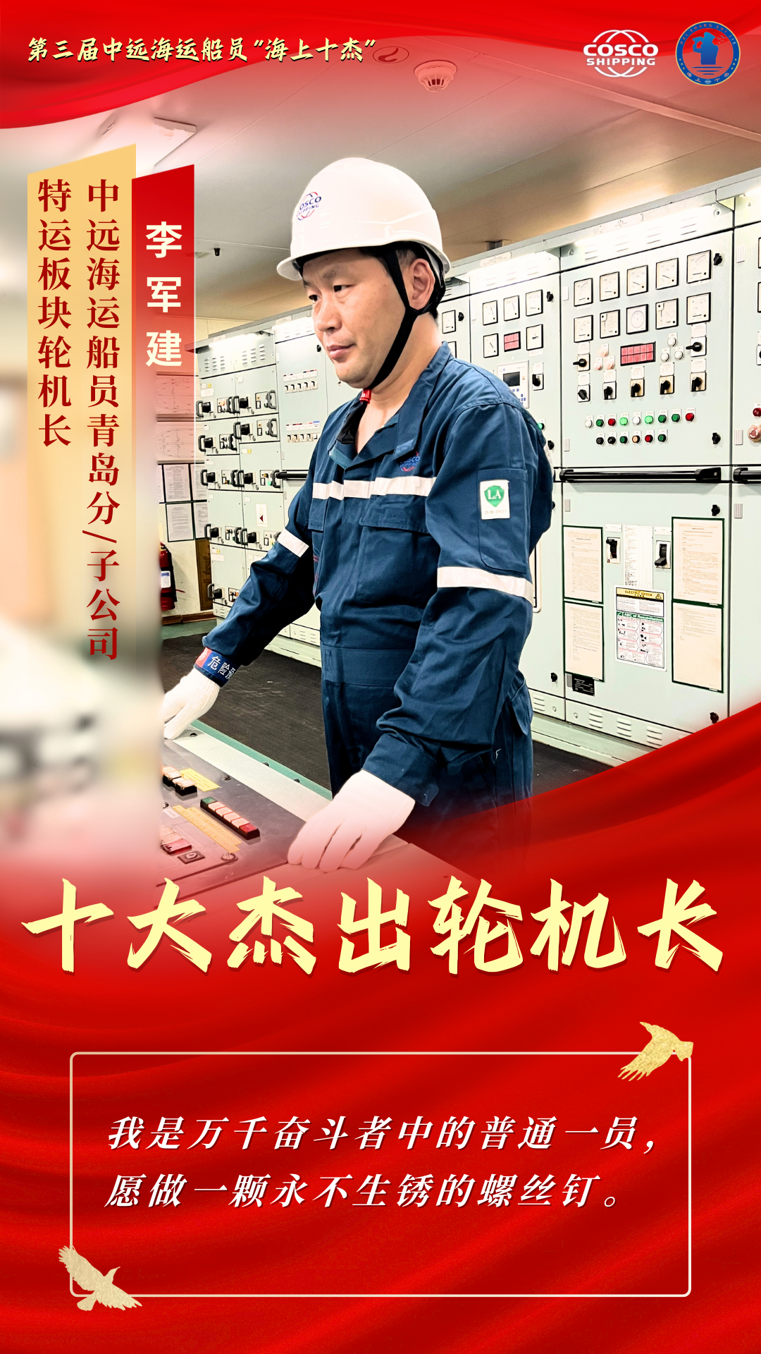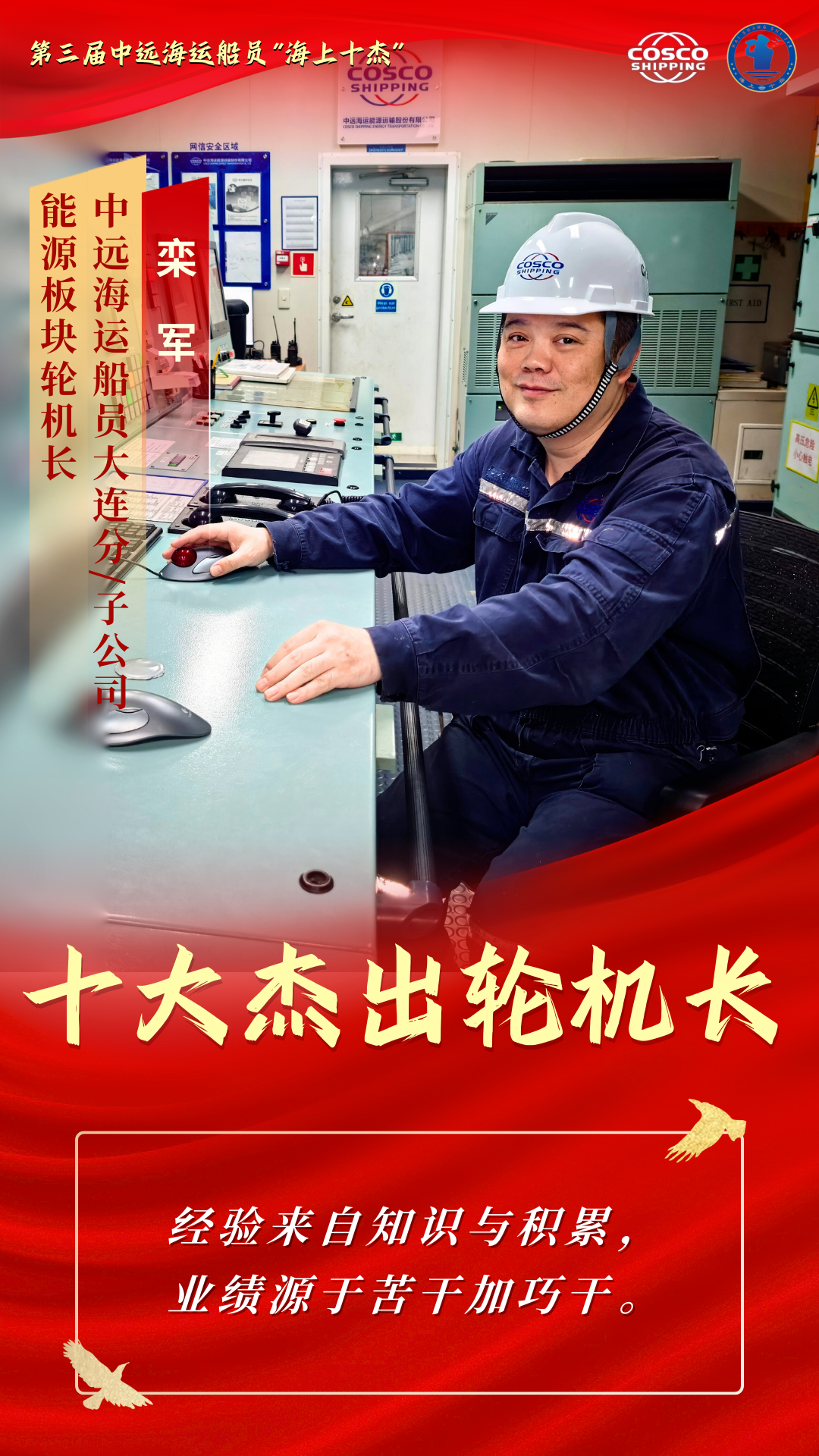 他们是船舶“动力源” 是巨轮“心脏”的守护者 他们在甲板之下 在机舱的轰鸣声中 以精湛技艺守护着船舶的安全运营 他们用专业与坚守 为万里航程注入不竭动力 本期“十杰风采”专栏 聚焦第三届中远海运船员“十大杰出轮机长” 让我们走近这十位优秀轮机长 聆听他们与钢铁巨轮的对话 感受那份在高温与轰鸣中淬炼出的忠诚与热爱