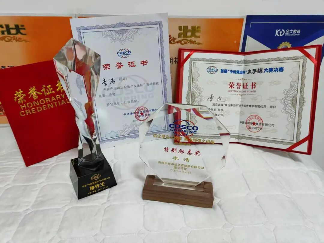 然而,真正让“成熟”二字实至名归的,是他履历中那一连串实打实的荣誉与考核成绩。入职8年来,他先后10次船舶履职考核均为优秀;2025年,在中远海运“安康杯”劳动技能竞赛中荣获一等奖,在“中远海运杯”水手结大赛中摘得“协作王”奖项。