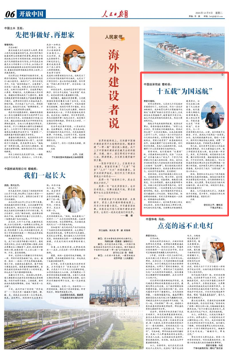 12月9日,《人民日报》海外版“海外建设者说(人民家书)”专栏,刊载了公司蹇松邑船长题为《十五载“为国远航”》的一封家书。
